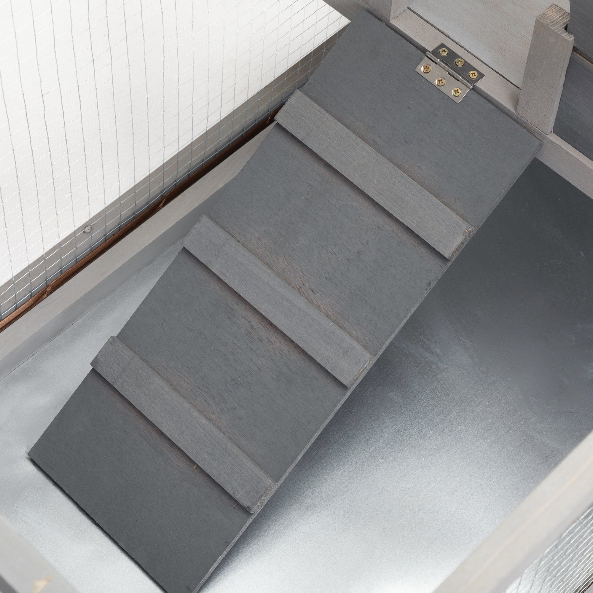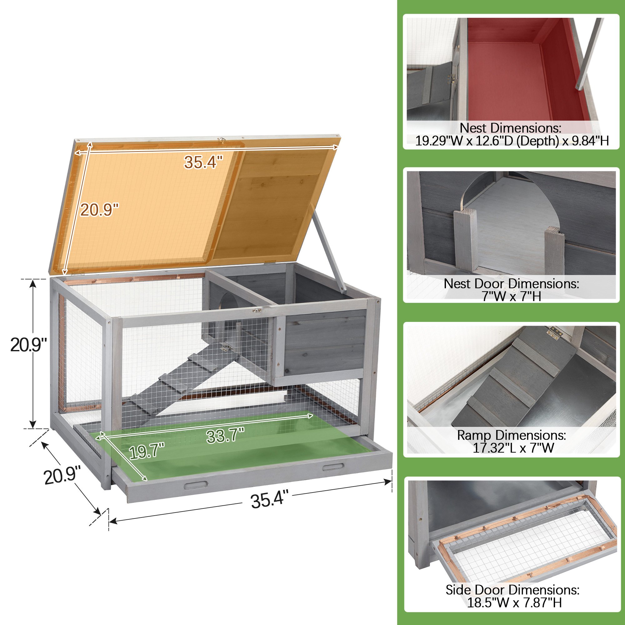 Specification:Color: GrayMaterial: Fir+Galvanized Wire MeshOverall Dimensions: 35.4"L x 20.9"W x 20.9"HTop Board Dimensions: 20.9"L x 14.2"D x 0.8"HTop Overall Dimensions: 35.4"L x 20.9"D x 0.8"HWire Mesh Dimensions: 21.1"L x 19.5"WFront and Back Wooden Frame Dimensions: 33.9"L x 17.3"W x 0.8"HLeft and Right Wooden Frame Dimensions: 20.9"L x 20.1"W x 0.8"HDoor Board Dimensions: 19.3"L x 9.7"W x 1.6"HDoor Dimensions: 7.1"L x 7.1"W x 0.8"HBatten under the Door Dimensions: 16.9"L x 0.8"W x 0.8"HLadder Dimensions: 17.3"L x 7.1"W x 0.6"HResting Area Dimensions(inner): 19.3"L x 12.6"WRemovable Tray Dimensions: 33.7"L x 19.7"D x 1.8"HNet Weight: 18.5 lbs