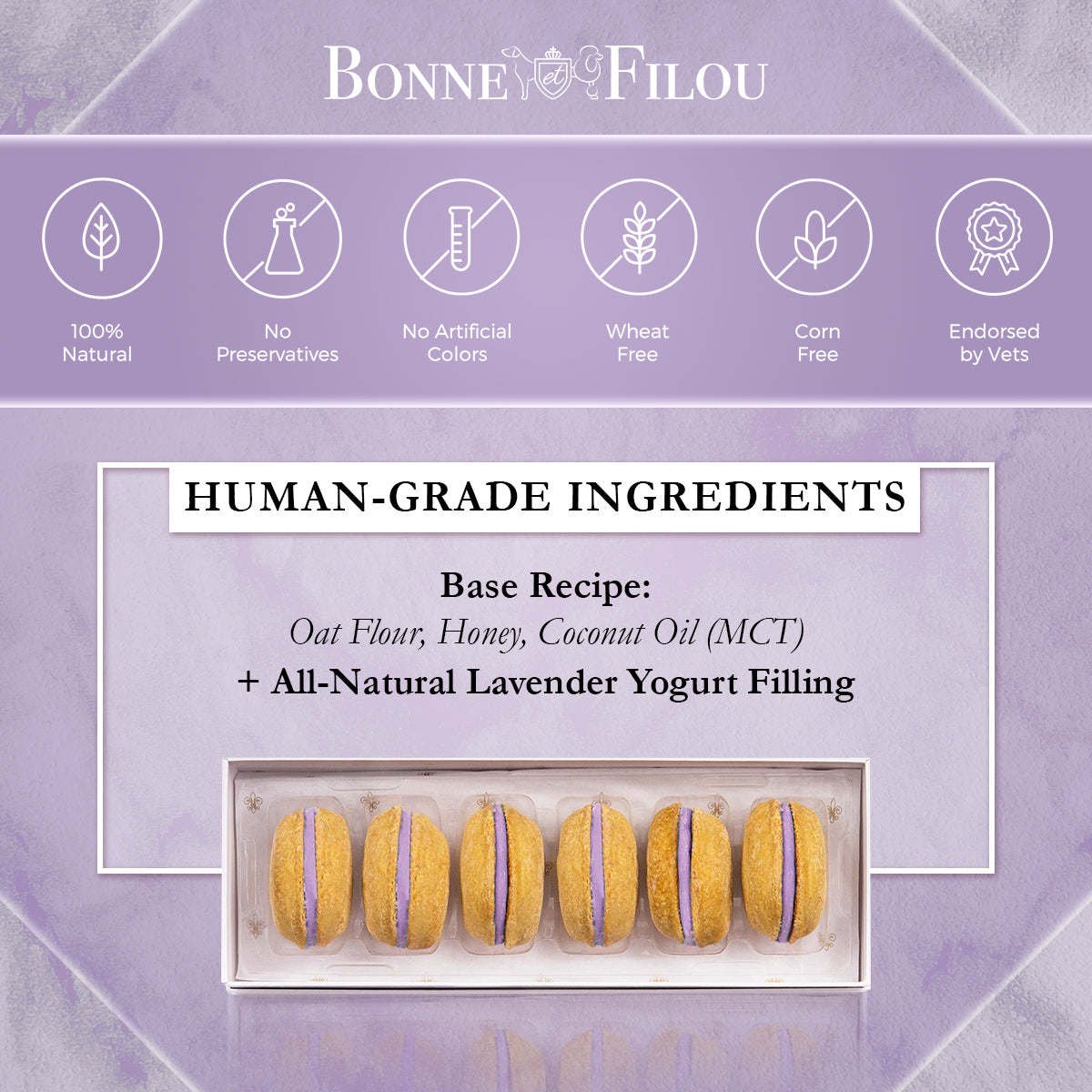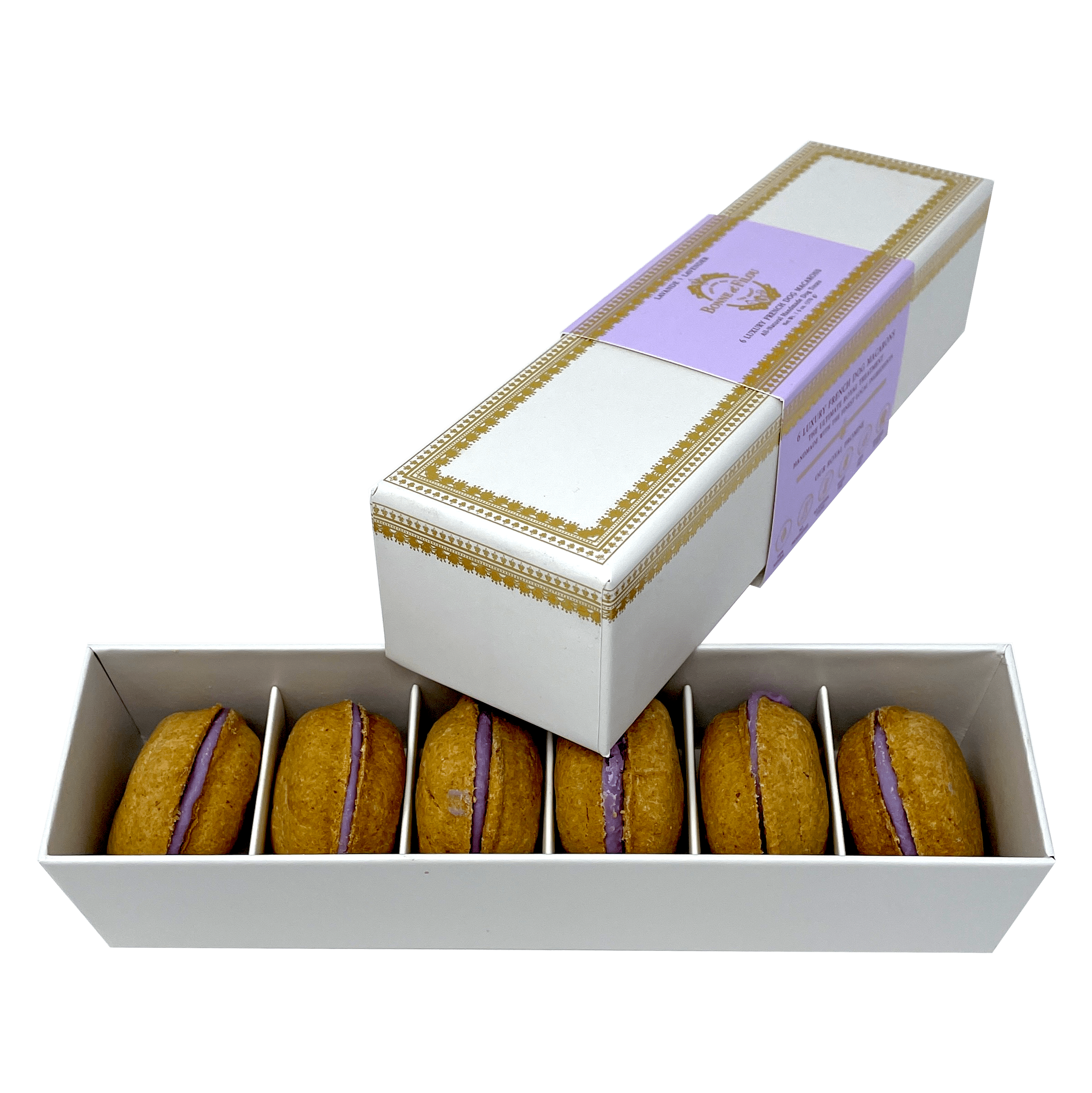 Dog Macarons - Count of 6 (Dog Treats | Dog Gifts)This box of our premium macaron treats features: - Box of 6 dog macarons- Handmade with premium human-grade ingredients in the USA- 100% natural; corn-free; wheat-free ingredients- No artificial coloring or preservatives- Hard treat designed for a long-lasting chew- Shelf life of 12+ months | No need for refrigerationBase Recipe Ingredients: Oat Flour; Honey; Coconut Oil; All-Natural Flavored Yogurt FillingFeeding Instructions:Our treats are hard; designed for a long-lasting chew. For elderly or small dogs; we recommend breaking the treat in smaller pieces (by twisting both sides).