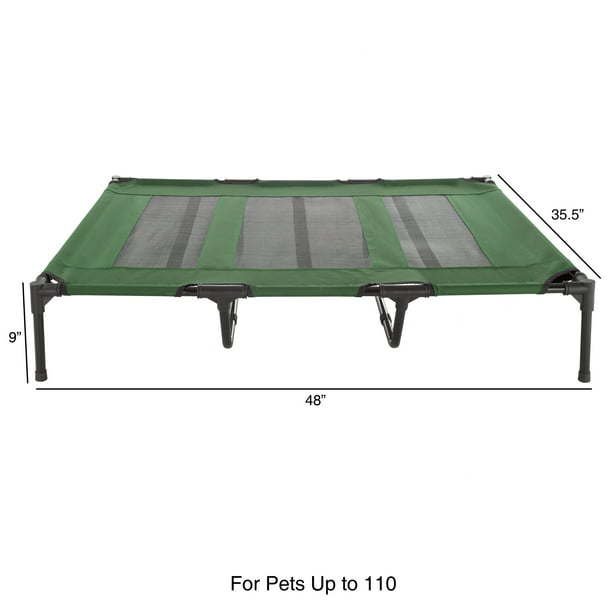 PRODUCT DETAILS -Materials: Mesh, Coated Steel, PVC Connectors, and Water-Resistant Canvas. Dimensions: (L) 48'x (W) 35.5' x (H) 9'. XL Dog Bed Carrying Case Included. For pets up to 110lbs. Color: Green.