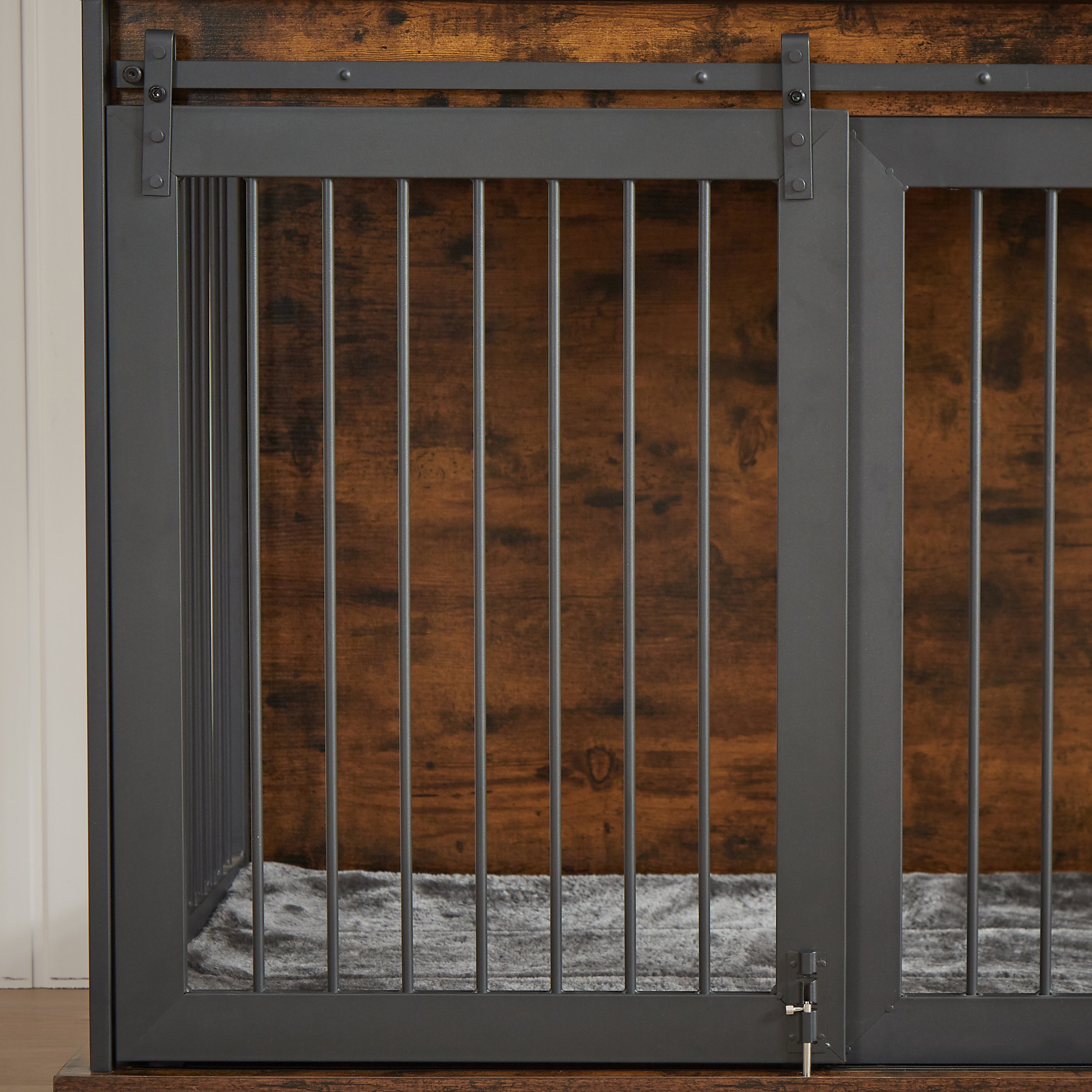 Heavy iron doors give an industrial feel, are stronger, more stable, and prevent your furry friend from chewing on the door frame.