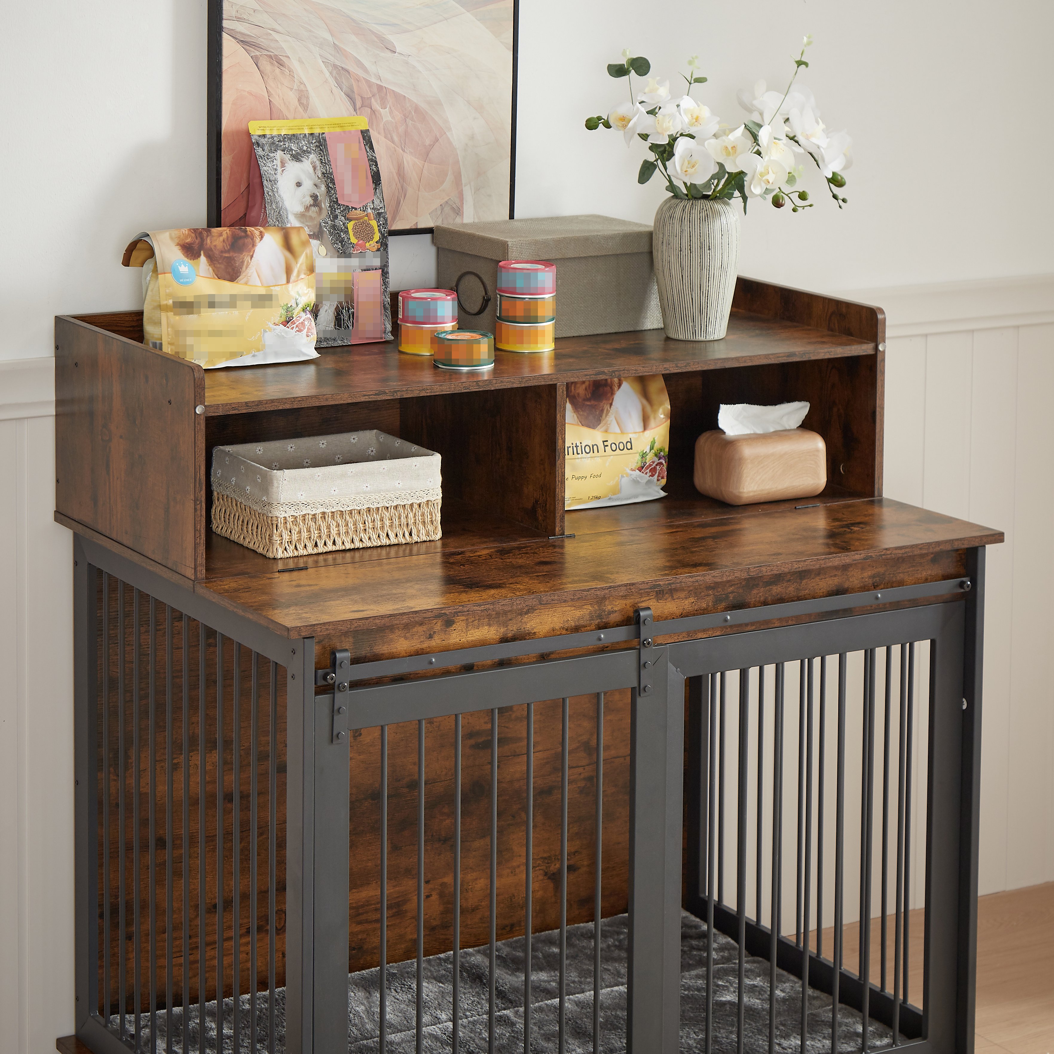 Home > Furniture type dog cage iron frame door with cabinet, top can be opened and closed. Rustic Brown, 43.7'' W x 29.9'' D x 42.2'' H