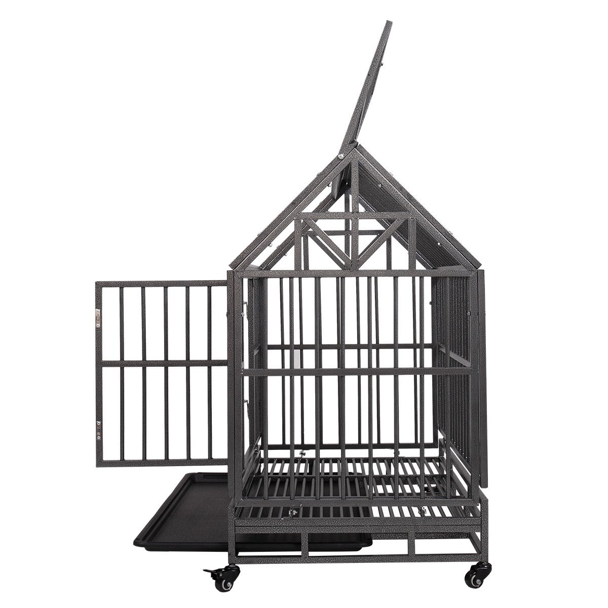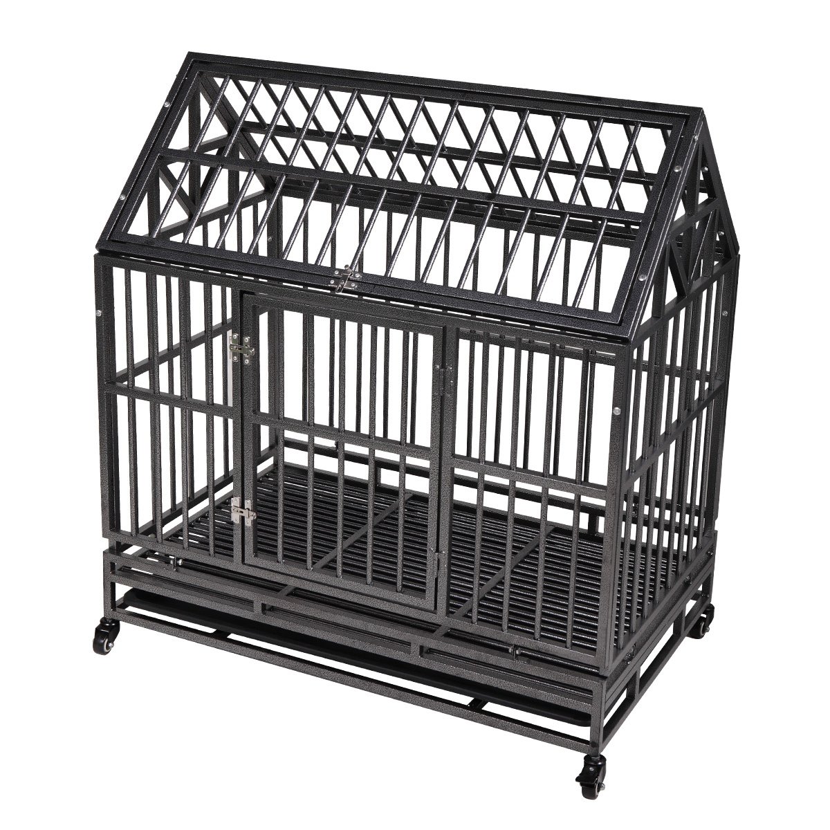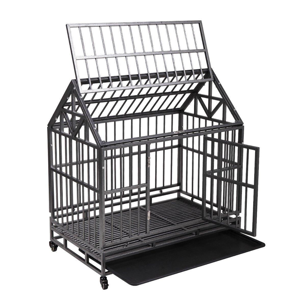 Heavy Duty Metal Dog Kennel Cage Crate with 4 Universal Wheels, Openable Pointed Top and Front Door, Black