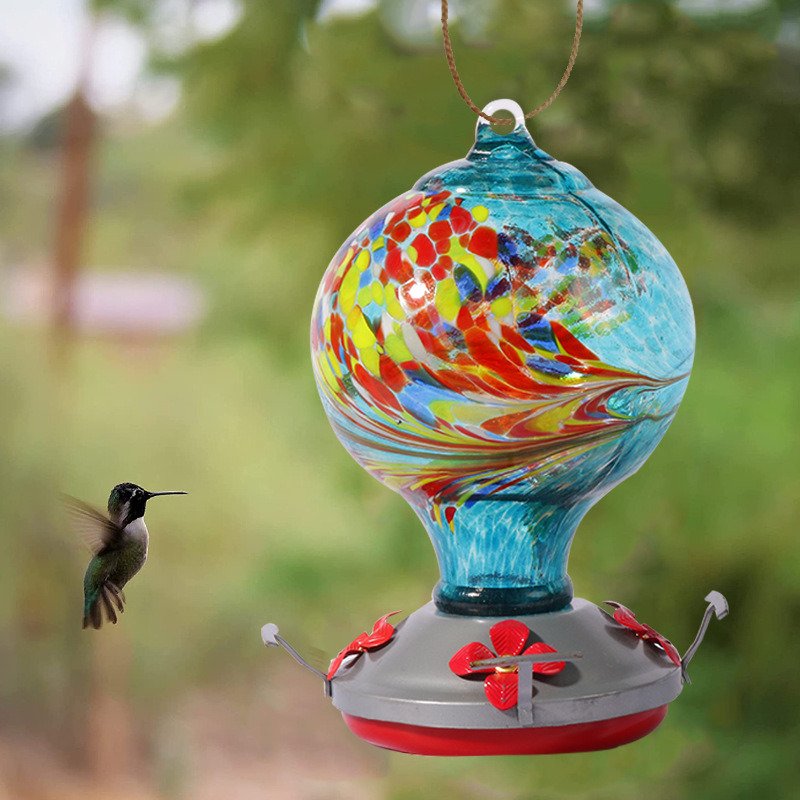 THE ARTWORK THAT HUMMINGBIRDS DART INTO - our hummingbird feeder comes in the distinctive flower bud shape with spiral grooves; which radiates the charm of curves and adds a great elegance to your yard. Mixing the natural beauty and modern arts; the bright colors flare on the crystal glass body will be equally attractive for human and hummingbirds to help you spend more time watching the birds rather than looking for them.