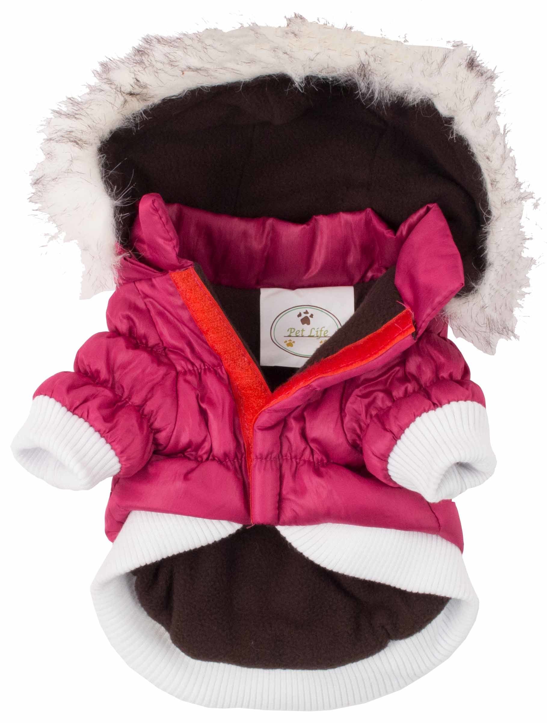 The Pet Life Metallic Parka Dog Coat contains Thinsulate thermal heat retention technology as an inner shell specially inserted between the fabric. This pet coat features matching tone-on-tone inner fleece fabrics, a faux fur removable zip-off hood, a leash slit, and belly-velcro closures for easier on and off access. This coat will keep your pet warmer during those harsher cold weather condition. Available in multiple sizes and colors.