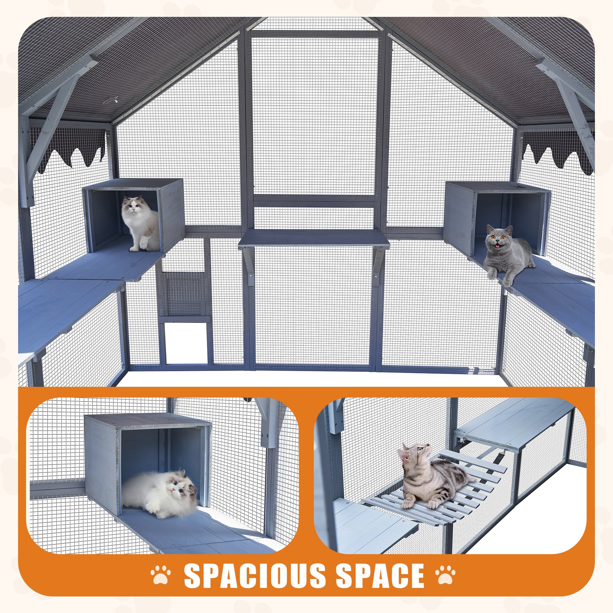 Outdoor Cat House Cat Enclosures 110" Large Kitten Playpen with Platforms,Upgrade Waterproof Cover-grey