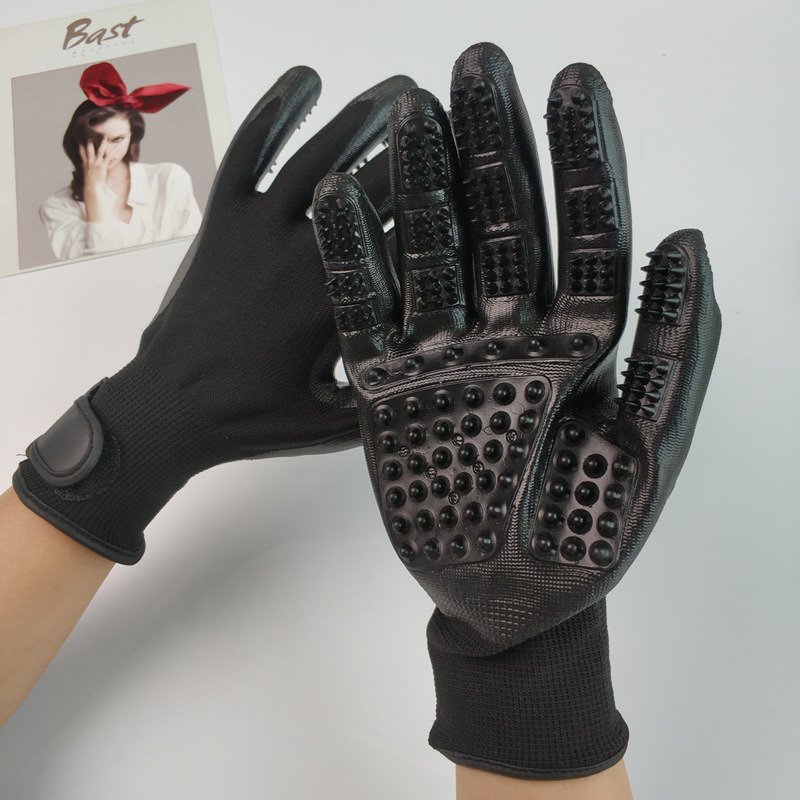 Effective Hair Removal Gloves: With upgraded round silicone tips; effectively reduce hair loss and massage deeply. This pet glove in turn helps boost your pet's skin's natural oil production and promotes healthy hair growth.PET AND HUMAN FRIENDLY DESIGN: When you are grooming your pet; the five-finger design of this epilation glove allows you to easily touch anywhere; just like your bare hands; calming your pet and making him feel like he will be pampered. Make every grooming feel more like a relaxing bonding experienceEasy to clean Dog grooming gloves on the palm and back without worrying about pet hair sticking to the fabric. Just peel off the fur layer when done; or rub your handsVersatile Pet Gloves: Grooming; peeling; massaging or bathing; this pet glove can handle everything and works effectively on any type of hair; straight or curly. So you can keep all your furry friends like cats and dogs neatly organized and cost-effectiveONE SIZE: Regular size beauty glove with elastic wrist strap for a comfortable fit. This way; you can operate with as much flexibility as possible without taking off your gloves