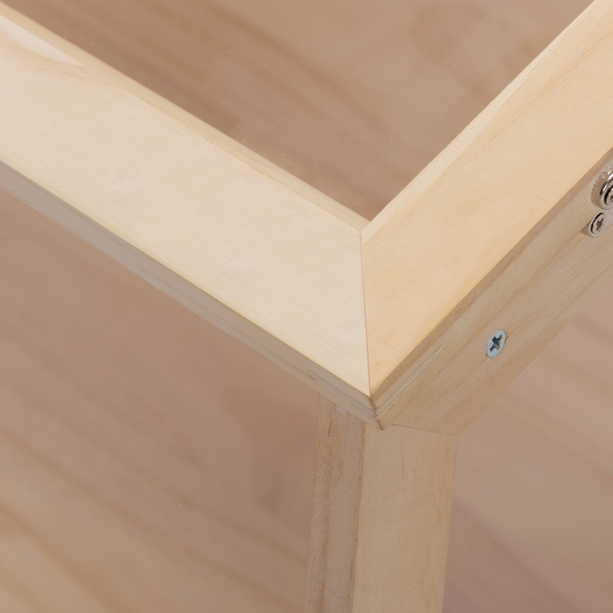 Specification:Color: BurlywoodMaterial: Pine + Plastic + Wire MeshOverall Dimensions: 31.5"L x 16.15"W x 15.75"HFront Acrylic Plate Size: 30.31"L x 12.16"W x 0.08"T Side Panels Size: 15.16"L x 15.16"W x 0.6"TBackboard Size: 31.1"L x 15.2"W x 0.47"TBase Plate Size: 30.2"L x 15.2"W x 0.47"TWeight Capacity: 33 lbsNet Weight: 14.10 lbsNote: The product includes a manual in English